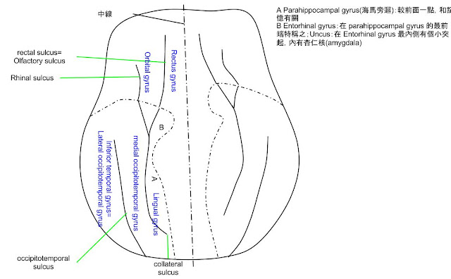B Entorhinal gyrus:在 parahippocampal gyrus 的最前端特稱之;Uncus:在 Entorhinal gyrus 最內側有個小突起,內有杏仁核(amygdala)