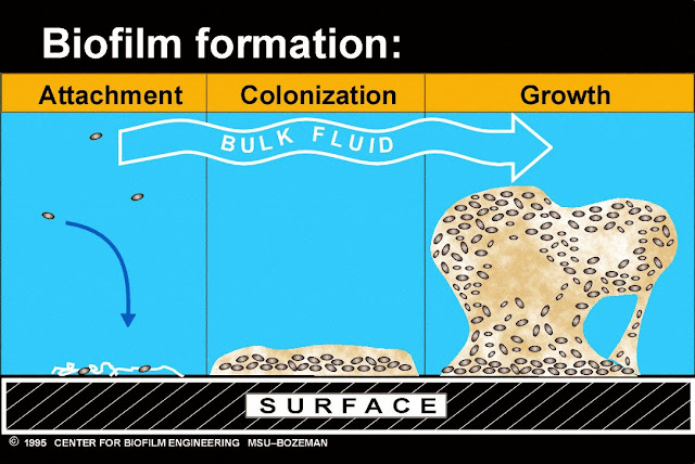 生物膜(biofilm) A. 細菌附著在宿主胞外或器械表面所形成的一層黏黏的東西稱之 B. 成分以多醣體為主 C. 通常都是附著在人工器械上,如:人工關節、導管(尿導管之類的)、人工瓣膜 D. 致病原因: a. 促進細菌大量附著,使細菌在器械上大量增生 b. 免疫細胞不易辨識生物膜中的細菌 c. 抗生素不易打入膜 E. 導致細菌性心內膜炎、人工關節炎、感染性導管炎等等 F. 治療方式:拿掉人工器械(此為唯一的治療方式,否則細菌會一直增生) 資料來源:華盛頓大學 ▼細菌(bacteria) 顯示/隱藏(show/hide) 標籤: 細菌(bacteria), 微生物(Microorganism) 以電子郵件傳送這篇文章BlogThis!分享至 X分享至 Facebook分享到 Pinterest